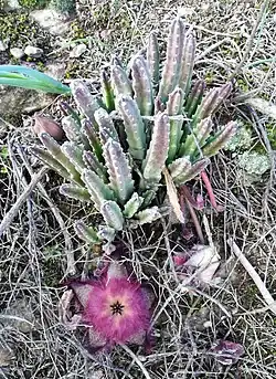 Stapelia hirsuta stems are subquadrangular in cross-section, about 20 centimetres (7.9 in) high, and 1 centimetre (0.39 in) to 2 centimetres (0.79 in) thick. Concave groves run vertically along the stems, between their four angles. This feature can sometimes help to distinguish S. hirsuta from many other Stapelia species with which it naturally co-occurs (e.g. Stapelia rufa, Stapelia engleriana) that typically have stems which are also subquadrangular, but which are more rounded in cross-section. The surface of S.hirsuta stems are also usually shortly pubescent. Leaf rudiments are 1-2mm long. Populations growing on sandstones can be glabrous stemmed, stemmed with purple mottling.[5][6]