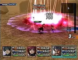 Enemy attacks can target either a player's hit points (HP) or mental points (MP). Players will also lose HP from using special attacks or lose MP from using symbology or runeology, which is functionally equivalent to magic in other games.[3] If a character loses all of their HP or, unlike most games, if they lose all of their MP, they are knocked out and unable to continue participation in the battle (unless certain revival items are used). Each character also has a Fury meter, which governs how fast the character moves over the battle screen, and how often actions can be performed. Standing still will replenish Fury, while any movement will continue to drain it or cause the character to lag. If all three characters are defeated, the game is over and the player must reload from their last saved game. If all the enemies are defeated, the player is awarded money (Fol) and experience points (EXP). When some groups of enemies are defeated, the player's characters can also receive a small amount of HP/MP, to counteract the HP/MP that was lost as a result of using special attacks or symbology/runeology.