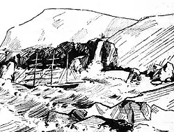 The second attempt to lower the boat was successful, and manned by four volunteers, the boat reached the shore and broke into pieces on the impact with the rocky beach.[100] All four men survived the crash,[100][101] and by 9:00 a.m. they managed to secure a rope from the Star of Bengal to a tree.[97] The donkey boiler was used to keep the rope strained.[74] However, as another volunteer was climbing along the rope with the breeches buoy, the ship's anchors finally gave in to the storm.[102] The rope became unstable and unsuitable for evacuation,[102] and the volunteer was catapulted 60 feet (18 m) into the air and killed as he landed on the ship's deck.[94][103] At 9:32 a.m., the ship struck the rocks.[104][105] During the next 54 minutes, the ship's hull broke in three pieces, and she sank at 55°49′30″N 134°17′0″W / 55.82500°N 134.28333°W with just her mizzen topmast visible above water.[54][56][69][106]