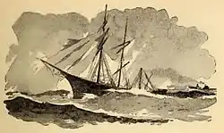 At one point, the tugs succeeded turning the Star of Bengal to a starboard tack, but she immediately reverted to port tack.[90] Whether due to a sudden change in direction of the wind or to an error on part of the Star of Bengal's crew, her sails were filled aback.[87] This resulted in a more dangerous situation, pushing all three vessels towards the rocky shore of Coronation island.[87] The two tugs continued to struggle to pull the Star of Bengal out of danger, but the ships continued to drift leeward.[89] Both tugs started to experience mechanical problems with their boilers due to overloading, and the Hattie Gage developed structural problems with her mast mounting.[91] At 3:50 a.m. the Star of Bengal dropped her anchors in 17 fathoms (102 ft; 31 m) of water.[92] Pulled into less than 10 fathoms (60 ft; 18 m) of water and occasionally as close as 100 feet (30 m) to the land,[93] the tugs finally severed their hawsers at 4:00 a.m., steamed out of danger,[93] and found shelter from the still-strengthening winds 12 miles (19 km) away, behind Warren Island.[67]