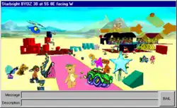 Players accessed Starbright World through terminals connected to a private DS3 network that linked hospitals to one another.[1] In the 3D world, children could chat with other users, play games and build new structures. The program also supported videoconferencing.[1][5] Spielberg and Norman Schwarzkopf Jr. (Starbright's chair of fundraising)[6] made cameos in the game as E.T. and a teddy bear, respectively.[7] Starbright World was an early example of a virtual world game[2] and one of the first uses of virtual reality in medicine.[3]