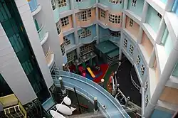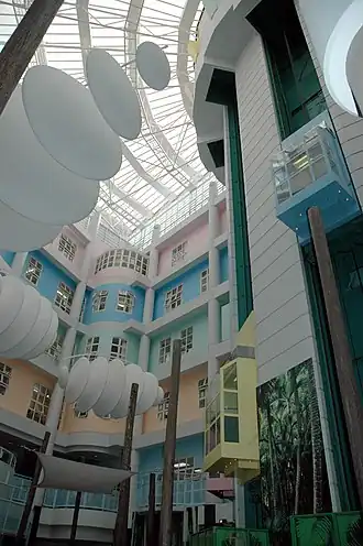 The main Starship building opened on 18 November 1991 on the grounds of Auckland City Hospital. Its name was chosen to appeal to children and young people and to reflect the building's design. The building has a central atrium lit by natural light and designed to a rainforest theme with a playground. Each of its five levels is painted a different colour, with a symbolic meaning: aqua for the Pacific Ocean; orange for land; blue for sky; yellow for sunshine; and pink for health.