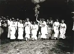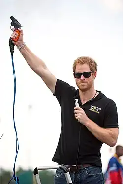 A starting pistol or starter pistol is a blank handgun[1] or, more recently, an electronic toy gun or device with a button connected to a sound system that is fired to start track and field races as well as some competitive swimming races. Traditional starter guns cannot fire real ammunition without first being extensively modified: Blank shells or caps are used to prevent expelling projectiles,[1] and only a small amount of smoke can be seen when shot. In most places, trying to modify the replica is illegal.[2]