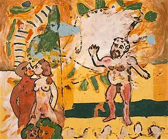 Following this, Paraskos was summonsed to appear in court in Leeds on a charge of displaying paintings that were 'lewd and obscene', in contravention of the Vagrancy Acts and that the images were likely to ‘corrupt and deprave' anyone who saw them. This court case was one of a number of important legal challenges to the freedom of the arts in the 1960s and 70s, starting with the Lady Chatterley trial in 1960, and ending with the Oz magazine trial in 1971.[6] However, 1966 appears to have been a key year in attempts by the British legal authorities to place restrictions on artistic freedom, with attempted and actual prosecutions that year of an exhibition at the Robert Fraser Gallery in London of paintings by Jim Dine, and a display of prints by the Victorian artist, Aubrey Beardsley, at the Victoria and Albert Museum, London,[7] in addition to the Paraskos trial.