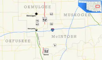 The southern SH-52 is a short, 4.06 miles (6.53 km)[1] state highway in McIntosh County, Oklahoma. It connects State Highway 9 to the town of Hanna.