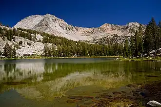 State Peak is a remote 12,620-foot-elevation (3,850-meter) mountain summit located in Kings Canyon National Park, in Fresno County of northern California, United States.[3] It is situated on Cirque Crest which is west of the crest of the Sierra Nevada mountain range, 3.03 miles (4.88 km) west of Arrow Peak, and 2.13 miles (3.43 km) southwest of Marion Peak, the nearest higher neighbor.[1] Topographic relief is significant as the west aspect rises 2,100 feet (640 meters) above State Lakes in 1.5 mile, and the southeast aspect rises 4,000 feet (1,200 meters) above South Fork Kings River in 1.5 mile.