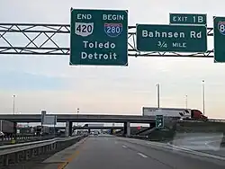 State Route 420 (SR 420) is a north–south state highway in the northwestern portion of the U.S. state of Ohio. The southern terminus of this four-lane divided highway is at a trumpet interchange with U.S. Route 20/US 23 (US 20/US 23) approximately 3.25 miles (5.23 km) northeast of the village of Luckey. The route’s northern terminus is at the southern terminus of Interstate 280 (I-280), where the two routes meet the Ohio Turnpike (I-80/I-90) at a double-trumpet interchange nearly four miles (6.4 km) southwest of Millbury. SR 420 made its debut in the late 1960s. It is a major route whose primary purpose is to link US 20/US 23 with I-280 and the Ohio Turnpike.