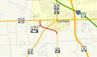 State Route 446 (SR 446) is an east–west state highway in the northeastern portion of the U.S. state of Ohio. The western terminus of SR 446 is at a T-intersection with U.S. Route 224 (US 224) in Canfield, approximately one mile (1.6 km) west of the downtown area. Its eastern terminus is at a Y-intersection with SR 46 about one mile (1.6 km) south of Canfield.