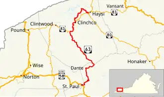 State Route 63 (SR 63) is a primary state highway in the U.S. state of Virginia. The state highway runs 39.28 miles (63.22 km) from U.S. Route 58 Alternate (US 58 Alternate) in St. Paul north to SR 80 and SR 83 in Haysi.