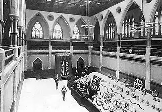 The first state funeral in Canada was held for Thomas D'Arcy McGee after his assassination in April 1868.[6] The first Governor General of Canada to receive a state funeral was the Lord Tweedsmuir in 1940, who died in office. Sir John A. Macdonald, Canada's first prime minister was also the first to receive a state funeral. Jack Layton was the first Leader of Her Majesty's Loyal Opposition who was not also a former prime minister to be honoured with a state funeral;[2] after lying in state in the foyer of the House of Commons, the funeral service took place at Roy Thomson Hall in Toronto.
