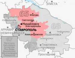 2016–present: Alexandrovsky District, Blagodarnensky District, Grachyovsky District, Ipatovsky District, Krasnogvardeysky District, Novoselitsky District, Petrovsky District, Shpakovsky District (Dubovsky, Kazinsky, Mikhaylovsk, Nadezhdinsky, Pelaginsky), Stavropol (Leninsky, Oktyabrsky), Trunovsky District[5][6]
