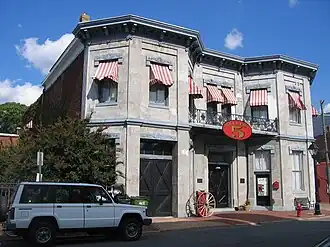 Designed by Richmond City Engineer Wilfred Emory Cutshaw, the building has a triangular plan to conform to the shape of its lot at the intersection of Brook Road and Marshall Street. Constructed of brick on a foundation of granite ashlar and covered with stucco which was scored to simulate stone, Steamer Company Number 5 is a late example of the Italianate style. This is a decorative fashion the building shares with many houses in the surrounding Jackson Ward area it served as firehouse from 1883 to 1968.[3]