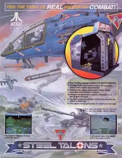 Steel Talons is an air combat arcade game. The player flies a helicopter equipped with a machine gun, rockets, and a limited number of air-to-surface guided missiles. It originated as a two-player cockpit arcade cabinet with both cooperative and competitive modes. In single-player mode or cooperative two-player mode, there are 19 missions. In competitive mode, players attempt to destroy each other's helicopter.