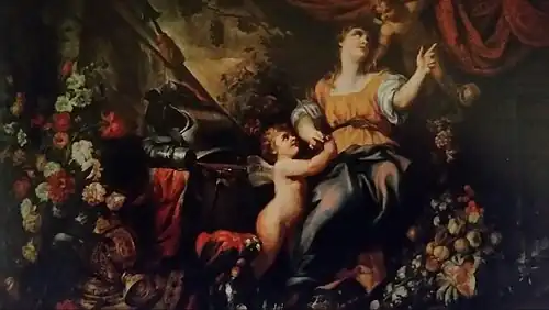 Camogli's work was also influenced by Giacomo Legi, another Flemish artist who also trained and worked in the Roos workshop in Genoa. Legi's work A market scene was cited directly in a composition referred to as The Market (Genoa private collection) executed by the young Domenico Piola with the collaboration of Stefano Camogli.[6] Camogli and Piola were regular collaborators on compositions in which Camogli was responsible for the still life elements and Piola for the figures. Examples are the Allegory of Summer (Collection Torriglia Chiavari, Palazzo Rocca) and the Allegory of Peace and Abundance (Private collection).[1] Camogli also collaborated as a flower and still life painter on compositions with his master Jan Roos, particularly in the 1630s.[4]