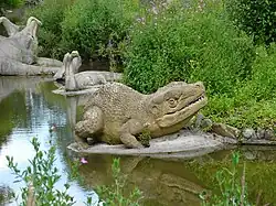Typical 19th-century depiction of a primitive stegocephalian, based on modern anurans and fossils now recognised as belonging to mastodonsaurids and Bromsgroveia