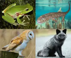 Examples of stegocephalians (clockwise from top left): Litoria phyllochroa, Acanthostega gunnari, Vulpes vulpes, and Tyto alba