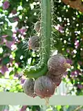 The fruit is similar to a dragon fruit. They are typically fleshy, up to 7.5 centimeters in length, and are adorned with thorns. The fruits tend to split open irregularly, and in most cases, the remnants of the flower remain attached until just before the fruit ripens. The seeds within the fruits are large, glossy, and usually dark black in color. They are also typically smooth in texture. Those of Stenocereus gummosus, acidic and very refreshing, are highly favored by the Seris of northwestern Mexico[2] who call the cactus ziix is ccapxl[3] – "thing whose fruit is sour". It is commonly known in Spanish as pitaya agria, or by the English translation sour pitaya. S. griseus (dagger cactus) fruits, locally known as iguaraya, are relished by the Wayuu people from the Guajira Peninsula of Colombia.[4]
