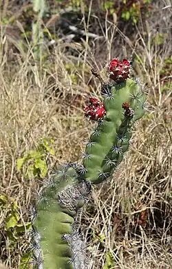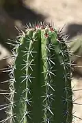 The species within the genus exhibit varying growth habits, often resembling trees or shrubs. They can also stretch out or creep to form dense thickets, and some species develop well-formed trunks. The green shoots of these plants are cylindrical in shape and feature distinctive cylindrical ribs. From these ribs, woolly areoles are present, from which strong spines emerge. Additionally, some species may have warts, while others do not. The flowers are mostly borne near the apex of the stems, funnel- or bell-shaped, and mostly nocturnal. The stem that supports the flowers (pericarpel) is often covered with numerous spiny areoles. They are considered easy to grow and generally grow slowly.[1]