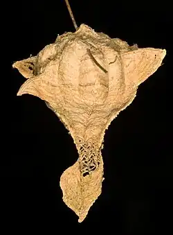 Metischnogaster: The genus includes two species with the most highly camouflaged nests consisting of a row of cells, the first of which is attached with its bottom to the tip of a thread-like suspension. The second cell is attached to the lower end of the first, the third to that of the second and so on. A special conical structure is built above the line of cells acting as a "drop stopper".