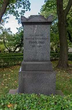 Pimenov died on 3 April [O.S. 22 March] 1833 at the age of 49 and was buried in the Smolensky Cemetery.[1][4] He had a daughter and two sons. The eldest son, Nikolai, also became a noted sculptor.[2] In 1936 the remains of both Stepan and Nikolai Pimenov were reburied in the Tikhvin Cemetery of the Alexander Nevsky Lavra.[3][6] In 1939 a granite altar-style tombstone was erected to the two Pimenovs.[6]