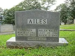 Ailes married Helen 'Nellie' Wales on June 24, 1939.[9] and had four children. He died on June 30, 2001, from a stroke at his home in Bethesda, Maryland.[9] He is buried in his home town of Romney at Indian Mound Cemetery.