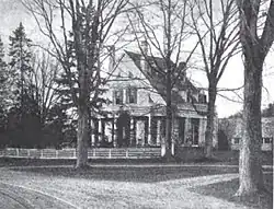 Barker, from one of Methuen's original families, had gone to seek his fortune in Tennessee and sent home enough money to build a house. The old farm house was moved and on its site was built this imitation of a Southern mansion. The details of the house, such as the entrance, the Doric columns and frieze board above, classify it as Greek Revival. The builder freely adapted traditional elements: rows of dormers, triangular windows in the gable end, and railing above the porch mimicking gingerbread fretwork.[3]