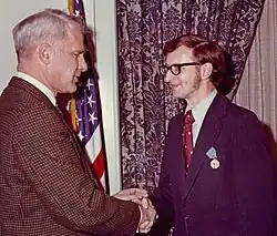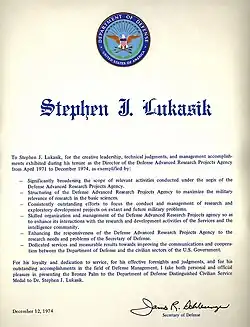 Lukasik was awarded the Department of Defense Distinguished Civilian Service Award and Medal twice - initially in January 1973 by Secretary of Defense Melvin Laird, and again in December 1974 by Secretary of Defense James Schlesinger.[25] The second award included an Oak Leaf Cluster. As shown in the accompanying citation, the award was given for multiple major achievements as DARPA Director including "significantly broadening the scope of relevant activities conducted under the aegis of the Defense Advanced Research Projects Agency."