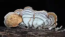 Stereum lobatum (false turkeytail)[1] is a basidiomycete crust fungus, which means it does not have the traditional mushroom gills nor stem, but rather grows flat or with shelf-like protrusions on wood. The spores are produced on basidia, just like the gilled mushrooms, but instead of gills, the hymenophore (spore-bearing surface) directly houses the reproductive parts.