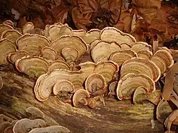 Stereum ostrea, also called false turkey-tail and golden curtain crust, is a basidiomycete fungus in the genus Stereum. It is a plant pathogen and a wood decay fungus. The name ostrea, from the word 'oyster', describes its shape.[2] With concentric circles of many colors, it highly resembles Trametes versicolor, turkey-tail, and is thus called the 'false turkey-tail'. The stemless fruiting body is shell-like and grows 1–7 cm (0.39–2.76 in) high. It is tough and inedible. It grows on tree bark. This fungus is native to the island of Java, Indonesia and has been misapplied to the North American Stereum species Stereum fasciatum, Stereum lobatum, and Stereum subtomentosum.[4]