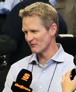 Stephen Douglas Kerr (born September 27, 1965) is an American professional basketball coach and former player who is the head coach for the Golden State Warriors of the National Basketball Association (NBA) and the U.S. national team. He is known as one of the most accurate three-point shooters in NBA history and holds the record for highest career three-point percentage. Kerr is also a nine-time NBA champion, having won five titles as a player and four as a head coach. He was named one of the 15 Greatest Coaches in NBA History.
