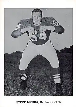 Steve Myhra (pronounced "MY-ruh") (April 2, 1934 – August 4, 1994) was an American professional football player who a kicker, guard, and linebacker for five seasons with the Baltimore Colts of the National Football League (NFL).