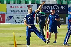 Prior to 2013, Finn had a frequent habit of knocking the non-striker's stumps with his knee during his delivery, sometimes dislodging a bail.[32] This ultimately caused controversy during the 2012 South Africa tour of England: after the South African batsmen complained of being distracted, the umpire decided to use a provision within the Laws to call a dead ball whenever Finn broke the stumps – with the first such call negating a wicket-taking delivery.[33] In 2013, Finn changed his run-up to correct the problem; and, the ICC introduced a new law to declare a delivery a no-ball, rather than a dead ball, if the non-striker's wicket is broken in the act of delivery – a regulation now commonly known as "Finn's Law".[34][35]
