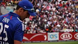 When England toured India in October for five ODIs, senior fast bowlers James Anderson and Stuart Broad were absent, rested and injured respectively. Finn was included in the squad.[23] In the first ODI he took 1–67 as England suffered a heavy defeat by 126 runs. He had no wicket in the second, finishing 0-50. He performed better in the next two matches, taking 2–44 and 3–45. Finn bowled all of his ten overs in the final match of higher series, finishing with 2–47 as England lost by 95 runs. Finn finished as England's leading wicket-taker in the series with 8 dismissals at an average of 31.62.[24] Commenting on Finn's performance in the series, which England lost 5–0, coach Andy Flower said "Coming into the series he wasn't a first-choice limited-overs cricketer for us. But he has been the outstanding bowler in our side."[25] Finn took 3–22 in a T20 match against India following the ODI series. After the tour Finn exploited a gap in England's international schedule to join Otago to gain experience.[26]