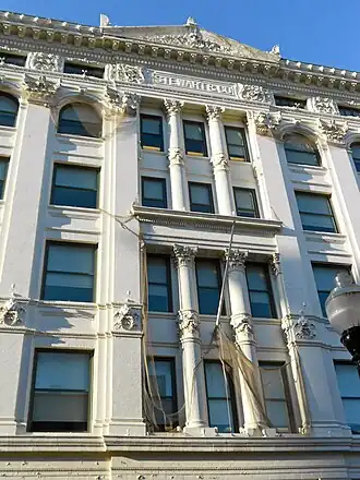 The Stewart's Department Store structure was designed in 1899 by Charles E. Cassell and is a six-story brick and terra cotta steel-framed building detailed in a highly ornate Italian Renaissance Revival style. It features an exuberant ornamental detail includes fluted Ionic and Corinthian columns, lion heads, caryatids, wreaths, garlands, cartouches, and an elaborate bracketed cornice.[2]