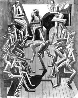 The young William Roberts also lived at Ormonde Terrace, and Gray appears twice in Roberts's 1914 drawing The Toe Dancer which, according to the catalogue of Roberts's 1965 Tate Gallery retrospective, was inspired by the dances performed by Gray's wife there. Mrs Gray is the contorted figure in the centre of the drawing.[14] The Toe Dancer is now in the Victoria and Albert Museum.[15] In an essay published posthumously, Roberts remembered that "At the rear of the house on a level with the first floor landing was a small glass conservatory, that Stuart had filled with hay almost to the roof, on which he slept fully dressed."[10] Augustus John described Gray as "a dear old humorist with a passion for vegetables".[12]