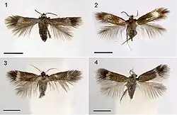 The wingspan is 4–5 millimetres (0.16–0.20 in). The thick erect hairs on the head vertex are black. The collar is black. The antennal eyecaps are white. The forewings are shining dark coppery-golden, costa deep purple with a shining silvery fascia beyond middle. The apical area beyond this is deep purple-fuscous. The hindwings are rather dark.[2] External image [3][4][5]
