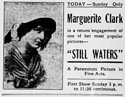 Still Waters is a 1915 silent film starring Marguerite Clark and directed by J. Searle Dawley. It was produced by Adolph Zukor's Famous Players Film Company. It was distributed by Paramount Pictures and is now lost.[1][2][3]