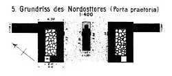The width of the fort wall was between 1.20 and 1.40 metres, while the foundations measured 1.80 metres. At the corners, the fort was rounded with an inner radius of 15 metres. The corner towers, which project outward at a width of 5.30 metres and a height of 3.80 metres, are particularly striking on the ground plan. It is likely that these towers were added in a later construction phase. No intermediate towers were discovered. The gate towers were also remarkably narrow and deep (6.90 × 4.20 m), with the exception of the porta praetoria (front camp gate), the remaining three gates were only equipped with a single passageway. The wall was accompanied by an embankment on the interior, with a width estimated to be between 4.60 and 5.10 metres, based on the evidence of the via sagularis (rampart road).[40]