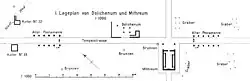 The existence of the wood and earth fort is corroborated by the discovery of a ditch that ran parallel to the southeastern ditch of the previous redoubt. The ditch was identified over a length of approximately 50 metres. As the ditch then bent to the southeast, it can be concluded that there was another intermediate enclosure between the small wooden fort and the later large cohort fort. It is probable that the south-western continuation of the ditch ran beneath the later town road. It is not possible to make any statements regarding the size of the camp. Similarly, the dating of the site remains uncertain. It is beyond doubt that it existed before the cohort fort, and it is probable that it was a successor to the small wooden fort.[39] Another possibility is that it was occupied for a brief period as a construction camp for the cohort fort.