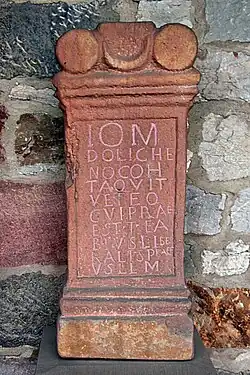 The presence of two mithraeums and a sanctuary for Jupiter Dolichenus provides evidence of oriental cults in Stockstadt during the late second and third centuries. In addition, inscriptions have been discovered which refer to a Fortuna sanctuary[11] and a nymphaeum.[8] The cult of Jupiter Heliopolitanus from Heliopolis (Baalbek), which was relatively uncommon in the north-west provinces, is also documented in the nearby town of Zellhausen.[12] The altar was donated by a prefect of Coh. I Aquitanorum, who hailed from Berytus (Beirut) in the vicinity of Heliopolis, and is believed to have introduced the cult to the region from his homeland. The numerous stone monuments in Stockstadt represent a unique collection of this type on the Upper Germanic-Raetian Limes.[13] The fort and vicus were in existence until the time of the Limesfall in the middle of the 3rd century CE.