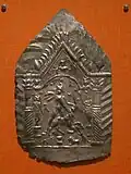 Mithraeum I (13.00 × 7.80 m) was discovered southeast of the fort in 1902. According to the finds, it is the younger of the two sanctuaries, built around 210 CE. A fire destroyed the building, but its extraordinarily rich inventory was preserved in the ground. These included a silver votive plate, fragments of a revolving cult image of Mithras[28] and 66 other stone monuments. Smaller finds such as coins are under-represented. The discovery of three different statues of Mercury suggests that the worship of this god was of particular importance. Each of the two mithraeums contained a statue of Mercury with a child in his arms.[49] The dedication of a large number of gods in the sanctuaries shows that religious beliefs gradually became mixed.[50]