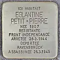 EGLANTINE PETIT-PIERRE BORN 1907 RESISTANCE FIGHTER FRONT INDEPENDANCE ARRESTED 28.3.1944 DEPORTED RAVENSBRÜCK MURDERED 28.3.1945 |