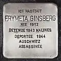 There are two narratives of life and death of Frymeta Ginsberg: According to the Stolperstein, she was born in 1912, detained at Malines in 1943, deported to Auschwitz concentration camp in 1944 and murdered there by the Nazi regime.