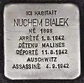 NUCHEM BIALEK BORN 1898 ARRESTED 1.8.1942 DETAINED IN MALINES DEPORTED 11.8.1942 AUSCHWITZ MURDERED 4.9.1942 |