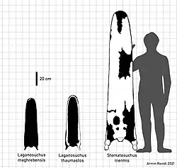 The only existing specimens of stomatosuchids belong to the recently described genus Laganosuchus, which is known from two species, L. thaumastos and L. maghrebensis from the Echkar Formation in Niger and the Kem Kem Beds in Morocco, respectively. The genus Stomatosuchus is known only from a holotype skull collected from the Bahariya Formation in Egypt, which was destroyed in World War II with the bombing of the Munich Museum.[4] Because Stomatosuchus is known only from brief accounts by Ernst Stromer and Franz Nopcsa (1926) and no additional material has ever been found, the genus remains enigmatic.[4][5][6]
