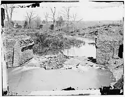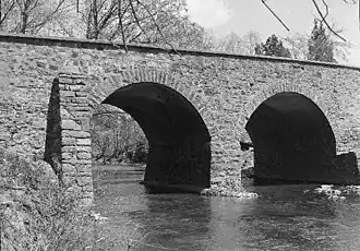 Stone Bridge crosses Bull Run at the eastern entrance of the Manassas National Battlefield Park in Prince William County, Virginia. The original bridge, built in 1825,[1] was destroyed when Confederate forces evacuated Northern Virginia in March, 1862. In 1884,[1] a new bridge, apparently similar to the original design, was built on the site of the old bridge. Modern day U.S. Route 29 crosses Bull Run on a bridge built in the late 1960s downstream of this one.