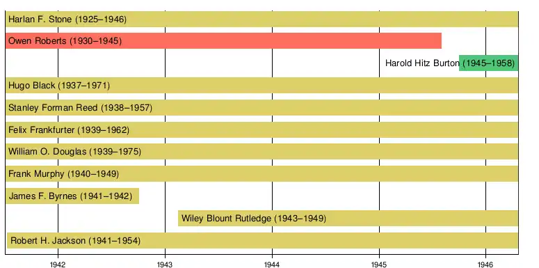 At the beginning of Stone's chief-justiceship, the Court consisted of Stone, Owen Roberts, Hugo Black, Stanley F. Reed, Felix Frankfurter, William O. Douglas, Frank Murphy, James F. Byrnes, and Robert H. Jackson (the latter two joined the court days after Stone's elevation to Chief Justice). In October 1942, Byrnes resigned from the court to become the war-time Director of the Office of Economic Stabilization; Roosevelt appointed Wiley Blount Rutledge as his replacement. Owen Roberts retired in July 1945, and President Harry Truman appointed Harold Hitz Burton to replace him.