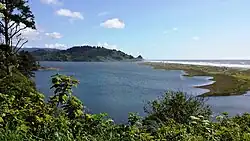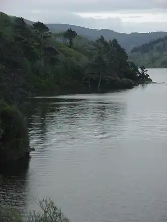 Stone Lagoon is similar to other coastal features of northern California including Humboldt Bay to the south and Lake Earl to the north. An alluvial plain is surrounded by steep uplands. Hills adjacent to Stone Lagoon have been identified as undivided pre-Cretaceous metasedimentary rock.[1] Studies around Humboldt Bay indicate tectonic activity along the Cascadia subduction zone has caused local sea level changes at intervals of several centuries.[2] The plain may support fresh water wetlands or Sitka Spruce forests following uplift events and salt marsh or inundated shellfish beds following subsidence events. At the present lagoon level, the sand bar normally separates the lagoon from the ocean during summer months. Winter precipitation may raise the water level in the lagoon a few meters above sea level. Hydrostatic pressure and storm surf may then breach the sand bar allowing the lagoon to drain into the sea and then receive tidal inflow until wave action reforms the bar.[3]