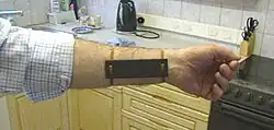 It was originally thought that these stone wrist-guards were bracers, used by archers to protect their bow arms from the string of the bow. However, recent research has highlighted that (in Britain at least) they do not commonly occur in graves in association with arrowheads (the Amesbury Archer being a notable exception), nor are they commonly found on the part of the arm that would need protection from the bowstring (on a right-handed archer, the inside left wrist).[3][4] However, of the 12 items identified as wrist-guards found in the burial ground in Holešov, in the Nitra culture graves most of them (7 of 9), and in the Bell Beaker culture graves some of them (1 of 3) were found in graves which also contained arrowheads.[5][6]