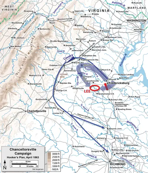In April 1863, Major General Joseph Hooker put his army in motion to force Lee out of his Fredericksburg positions. He sent Major General George Stoneman's 10,000-strong cavalry to move between Lee and the Confederate capital, Richmond. Hooker expected Stoneman to sever Lee's line of supply by destroying the strategically vital Orange and Alexandria Railroad at the town of Gordonsville. This would, Hooker hoped, compel Lee to withdraw from Fredericksburg while cutting him off from supplies and transportation. Hooker also saw to it that John Buford was given an active field command and rode to battle in April 1863 with the Reserve Brigade, an organization that contained the majority of the Regular Army cavalry units serving in the east.